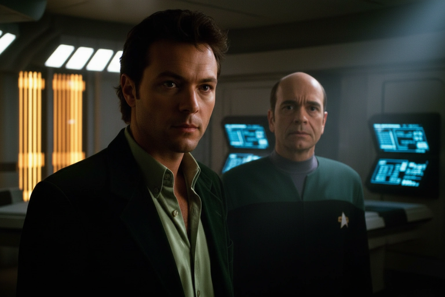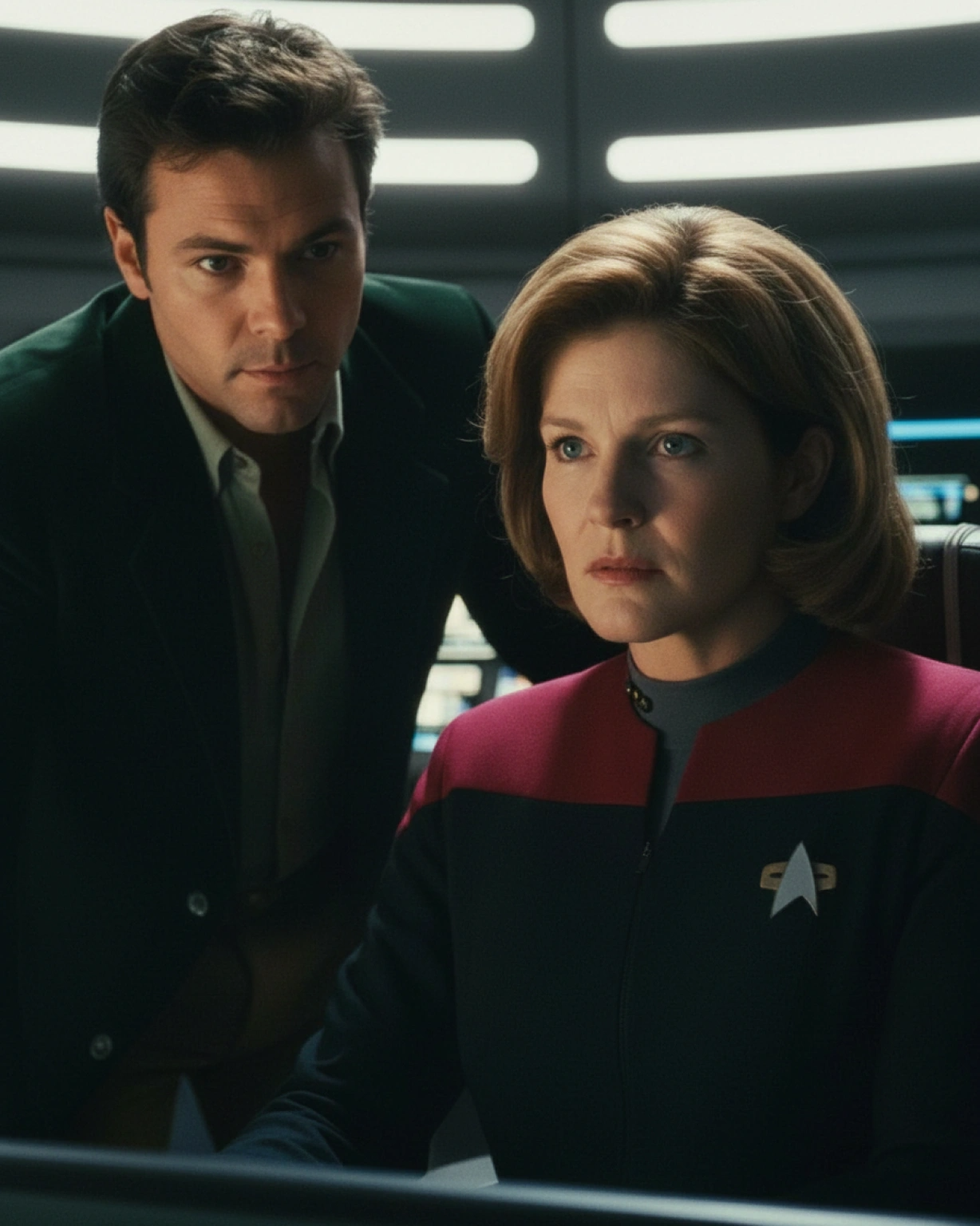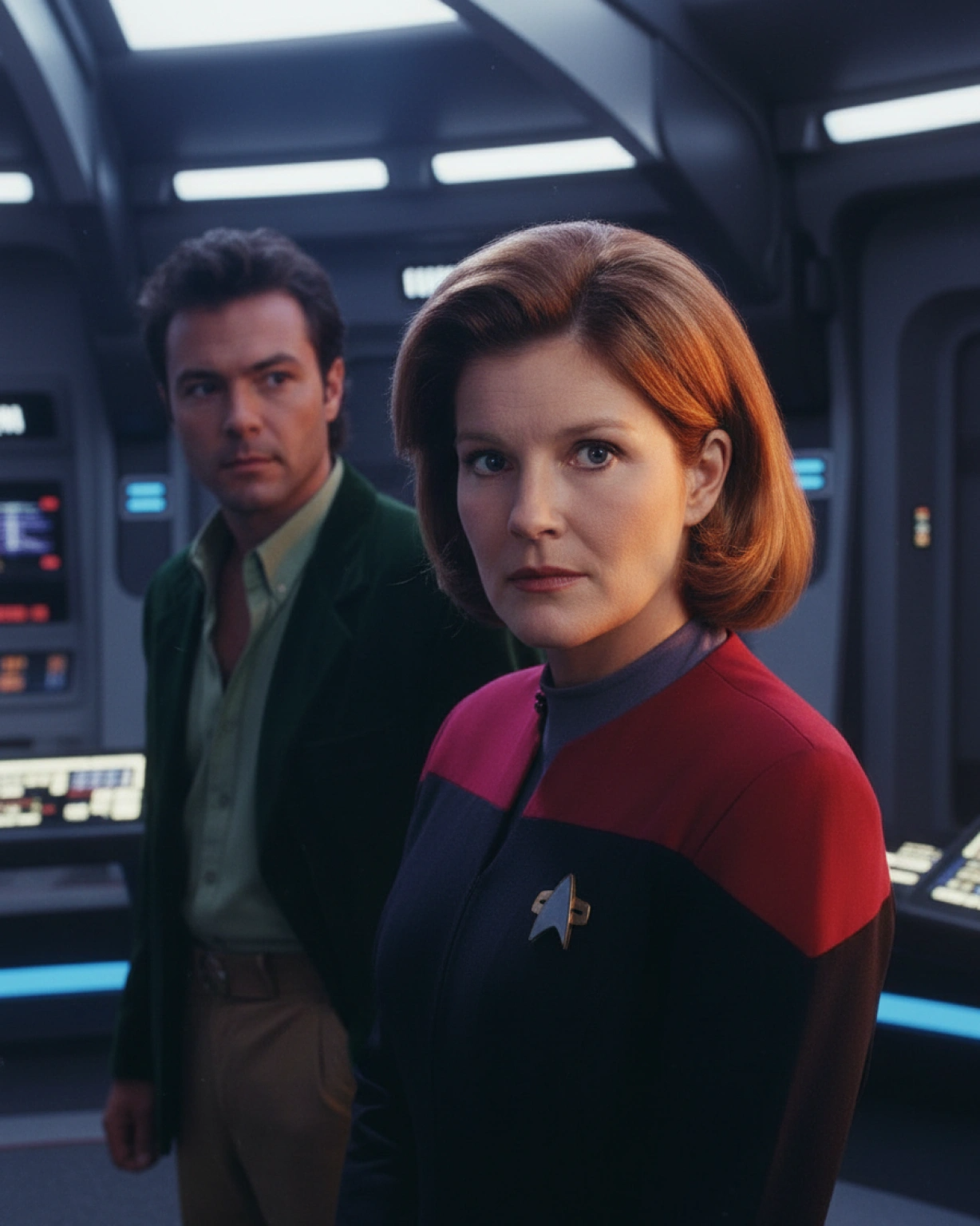 Michael French (The Doctor) and Kathryn Janeway (Kate Mulgrew), A Case for the Blue Box